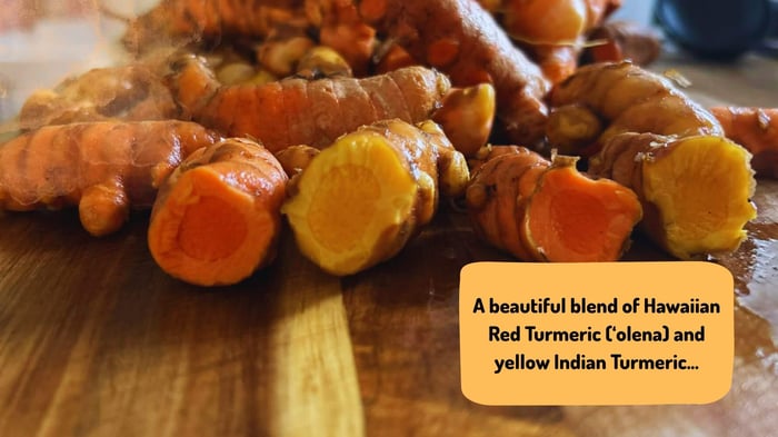 By blending red Hawaiian and yellow Indian varieties, we're combining the best of both: the unique mineral profile from Hawai'i's volcanic terrain and the traditional potency of Indian turmeric varieties used in Ayurvedic medicine for thousands of years. The red Hawaiian variety adds its own mineral complexity from our iron-rich lava soil, while the yellow Indian turmeric brings time-tested therapeutic properties.
